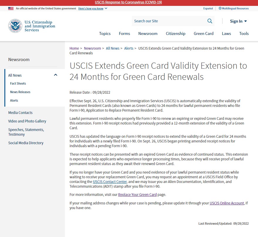 이민국은 이러한 문제를 해결하기 위해 기존의 1년이 아닌 2년을 자동 연장한다는 내용의 접수증 (receipt notice)를 발급하기로 결정하였습니다. 따라서, 9월 26일 이후 영주권 연장 신청을 하시는 분들은 2년 연장을 허용하는 접수증 (receipt notice)를 받게 됩니다.